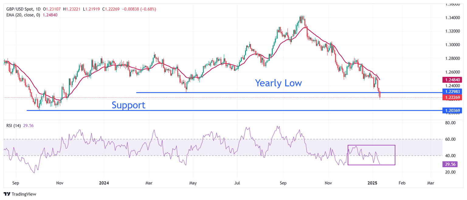 The Pound Sterling posts a fresh yearly low around 1.2200 against the US Dollar (USD) on Friday. The GBP/USD pair turned weak after a short-lived recovery move to near the 20-day Exponential Moving Average (EMA) near 1.2550, which is currently trading around 1.2490.