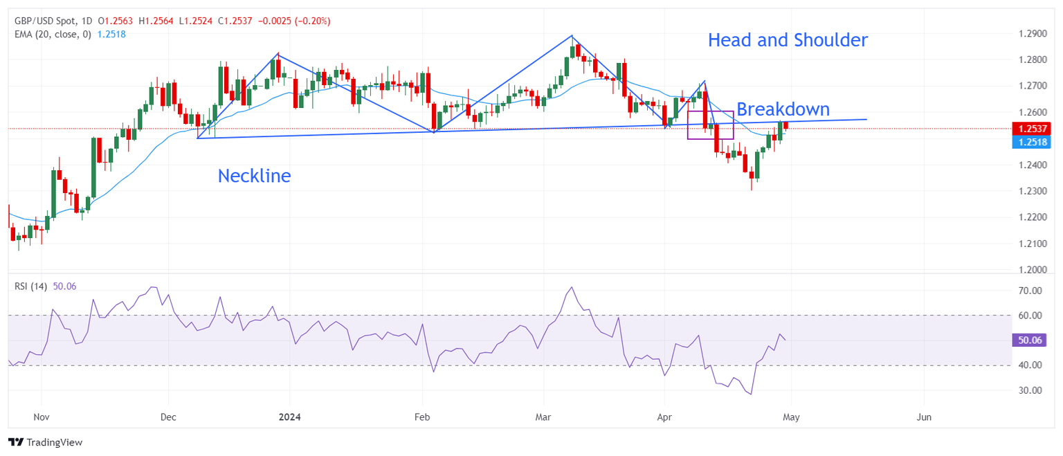 The Pound Sterling falls from a two-week high of 1.2570 against the Greenback. The GBP/USD pair struggled to extend its upside reaching the breakdown region of the Head and Shoulder chart pattern formed on a daily timeframe. The Cable witnessed a sharp fall after breaking below the crucial support of 1.2535 on April 12, but it has recovered recent losses since then.