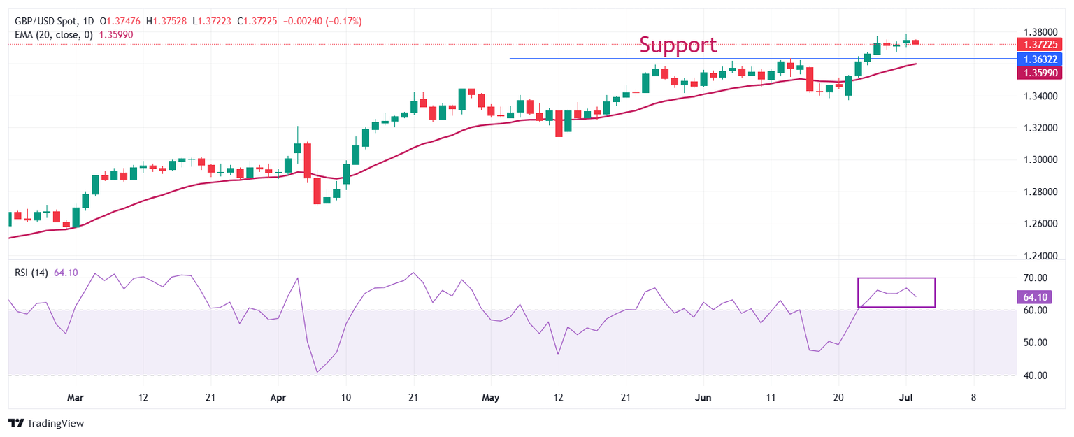 The Pound Sterling (GBP) corrects to near 1.3700 against the US Dollar (USD) during the European trading session on Wednesday from the fresh three-and-a-half-year high around 1.3800 posted the previous day. The GBP/USD pair faces selling pressure as the United States (US) currency gains ground, following upbeat JOLTS Job Openings data for May.
