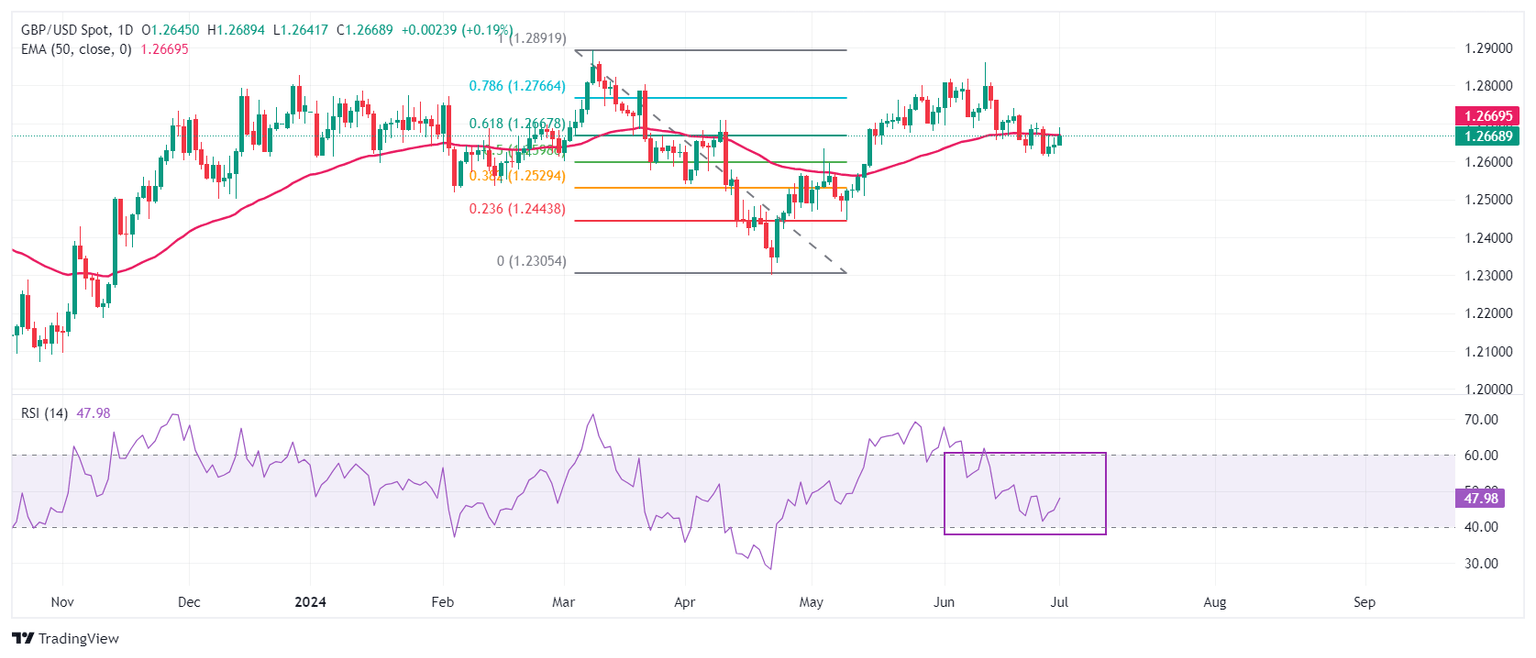 The Cable hovers near the 50-day Exponential Moving Average (EMA) near 1.2640, suggesting uncertainty over the near-term outlook.