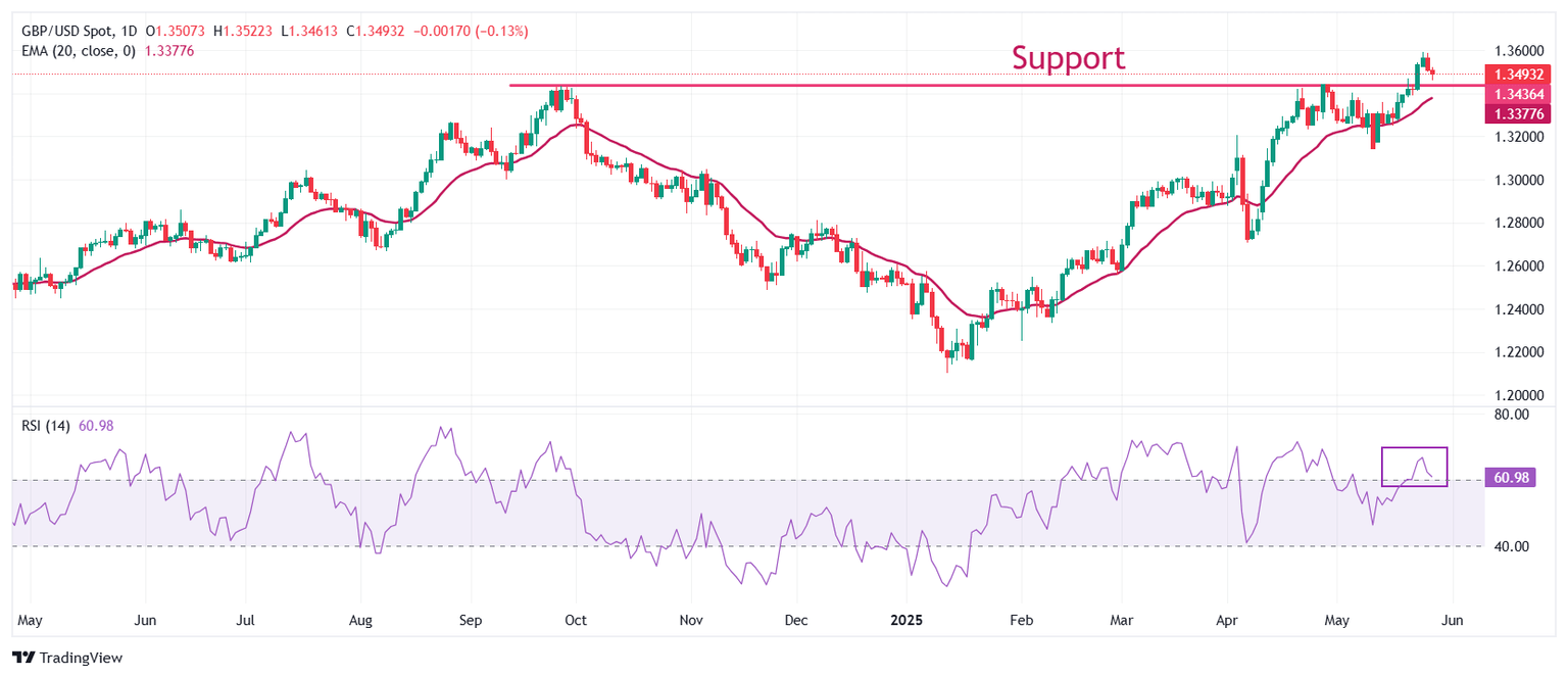 The Pound Sterling retraces to near 1.3460 against the US Dollar from the three-year high around 1.3600 on Monday. However, the outlook of the pair remains firm as the 20-day Exponential Moving Average (EMA) slopes higher around 1.3380.