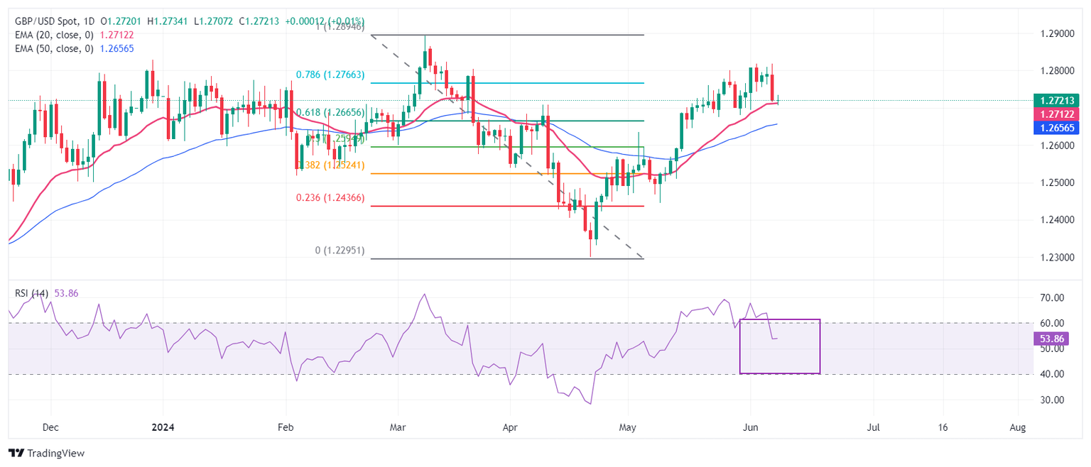 The Cable retraces to the 20-day Exponential Moving Average (EMA), which trades near 1.2710. The 50-day EMA is still sloping higher, suggesting that the overall trend remains bullish.