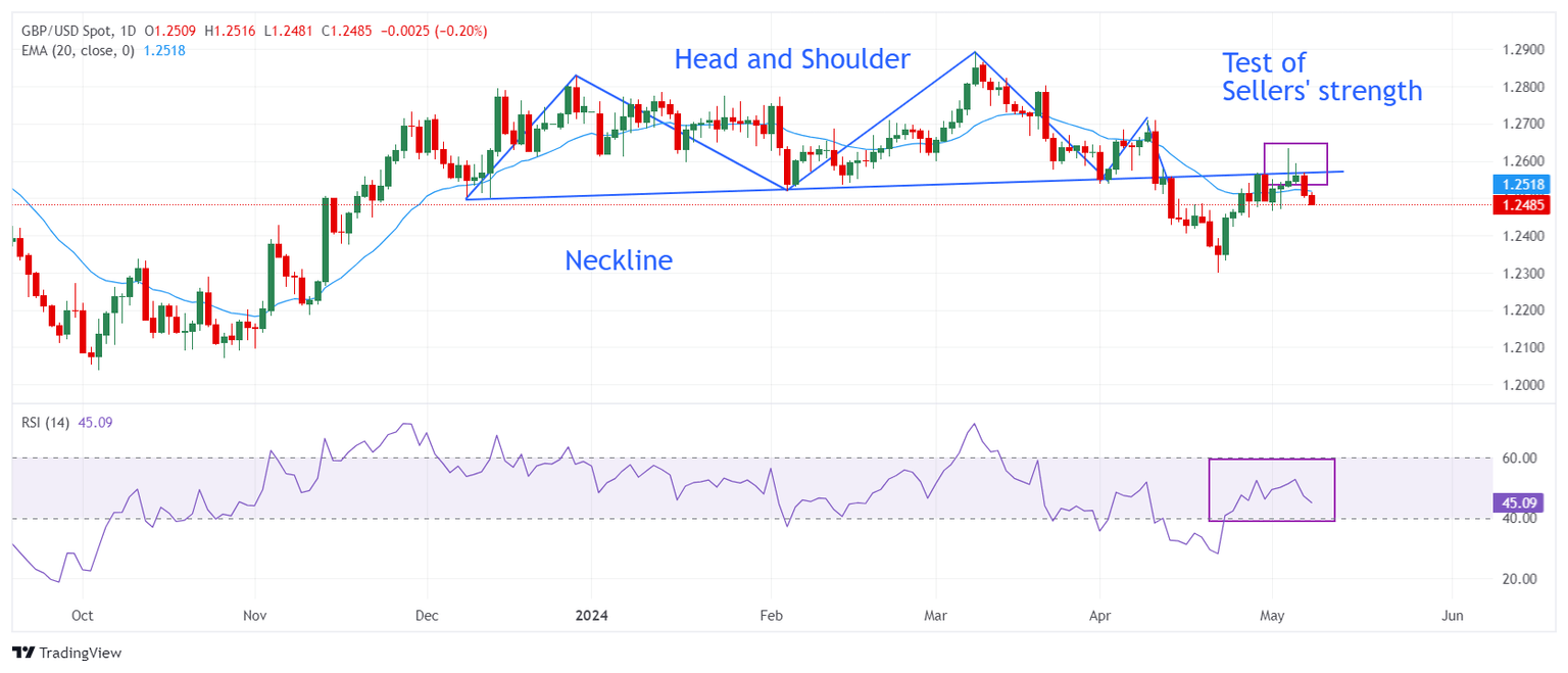 The Pound Sterling falls slightly below the psychological support of 1.2500. The GBP/USD pair is under pressure after facing strong resistance above the neckline of the Head and Shoulder (H&S) chart pattern formed on a daily timeframe. On April 12, the pair suffered an intense sell-off after breaking below the neckline of the H&S pattern plotted from December 8 low around 1.2500.