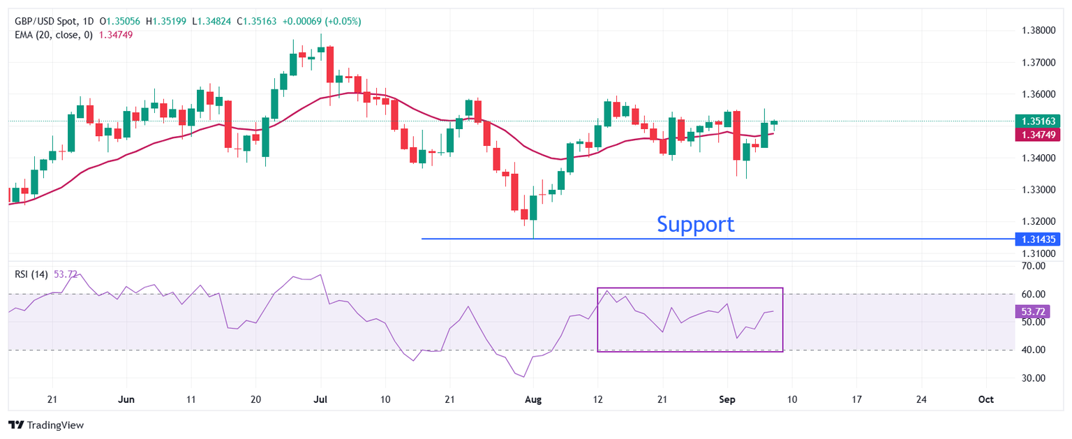 The Pound Sterling edges higher to near 1.3515 against the US Dollar on Monday, but is still inside Friday’s trading range. The near-term trend of the GBP/USD pair is sideways as it trades around the 20-day Exponential Moving Average (EMA), which is around 1.3475.