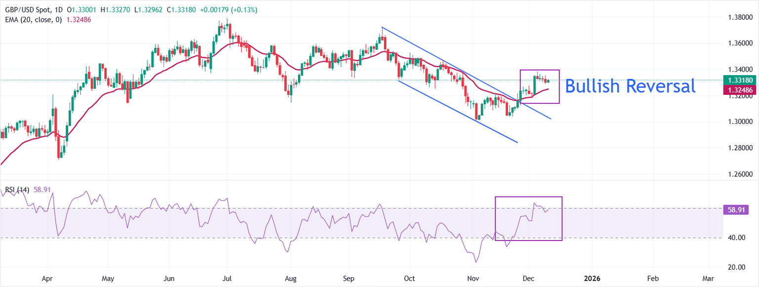 On the daily chart, GBP/USD trades at 1.3318. Price holds above the rising 20-day EMA at 1.3249, keeping the short-term uptrend intact. The average has turned higher in recent sessions, and dips would meet dynamic support near that gauge. A descending trend line from 1.3726, the September 17 high, was broken at 1.3026, removing overhead pressure and reinforcing a bullish bias.