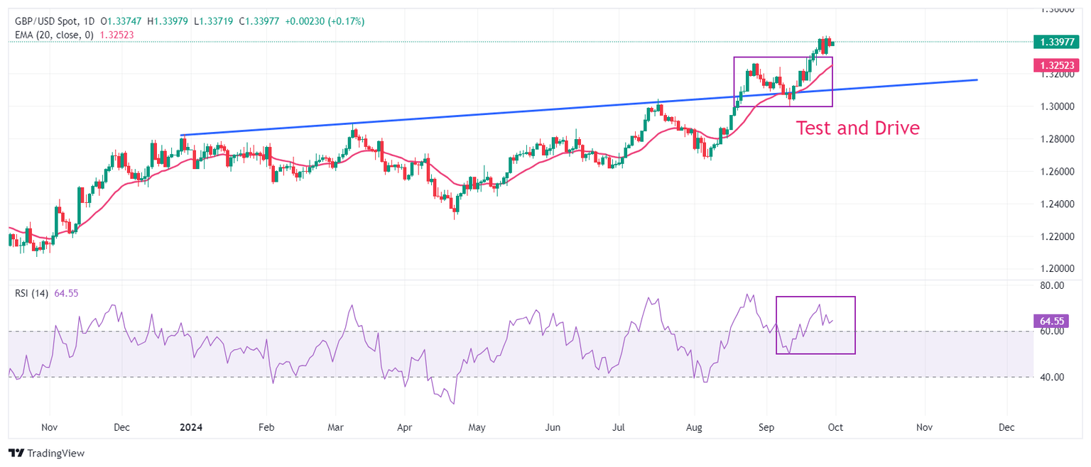 The Pound Sterling gains further above the key resistance of 1.3400 against the US Dollar in European trading hours. The near-term outlook of the GBP/USD pair remains firm as the 20-day Exponential Moving Average (EMA) near 1.3250 is sloping higher.