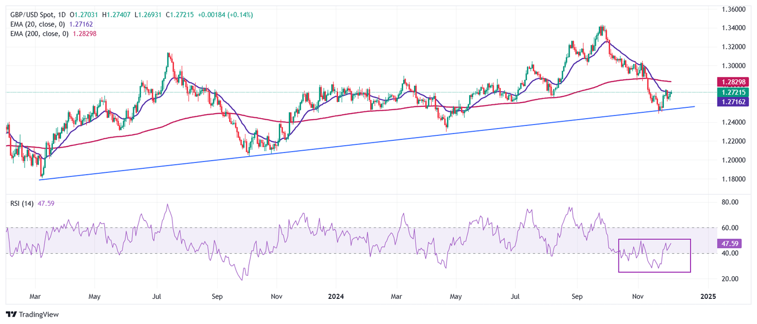 The Pound Sterling jumps to near 1.2750 against the US Dollar in North American trading hours on Thursday. The GBP/USD pair climbs above the 20-day Exponential Moving Average (EMA) around 1.2715 and aims to sustain above the same. However, the outlook remains bearish as the pair stays below the 200-day Exponential Moving Average, which trades around 1.2825.