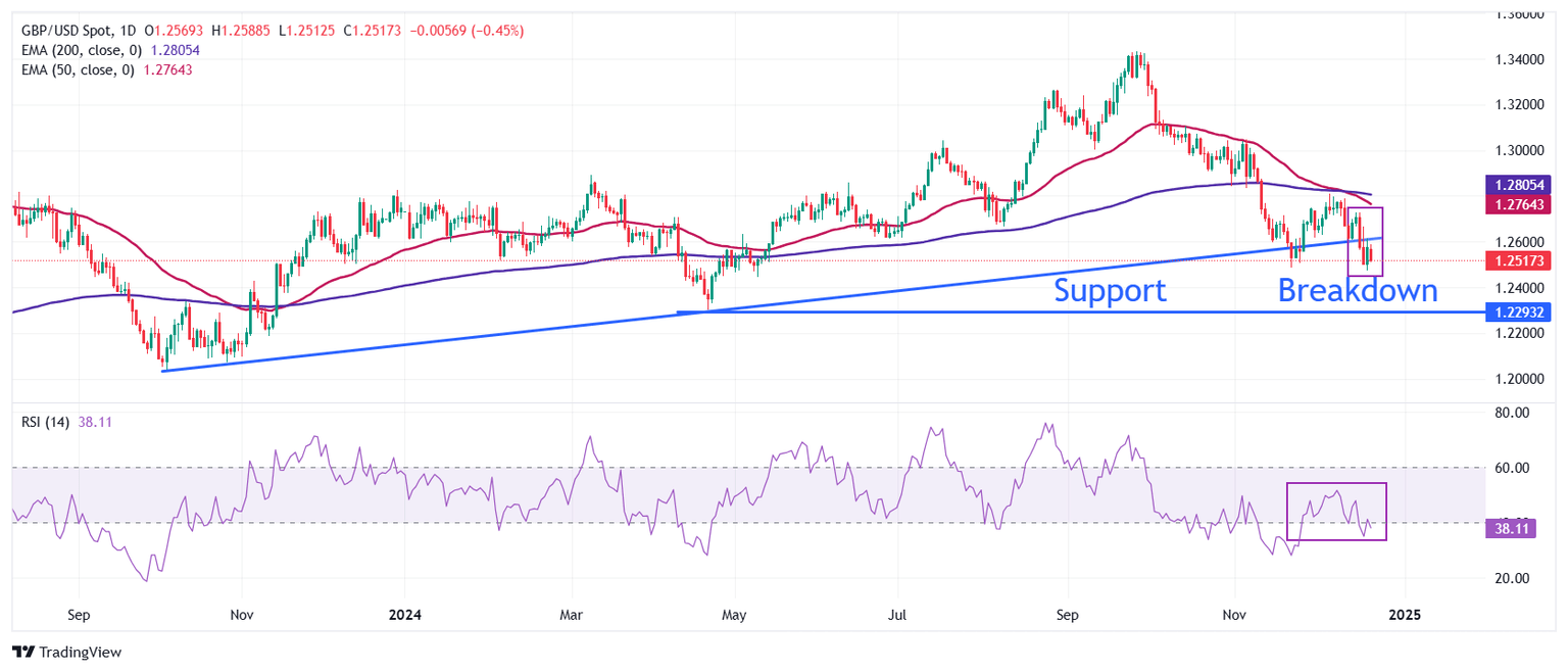 The Pound Sterling weakens against the US Dollar after a decisive break below the upward-sloping trendline around 1.2600, which is plotted from the October 2023 low of 1.2035.