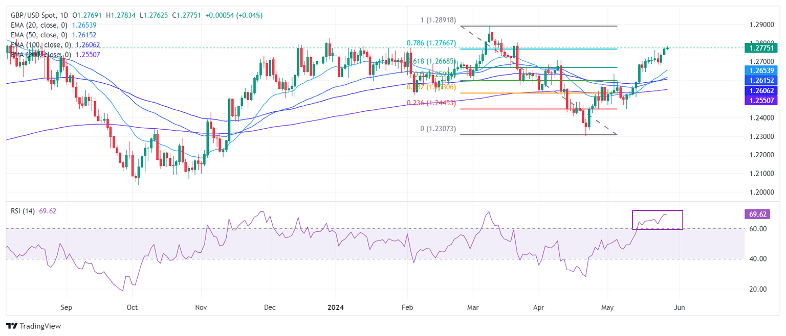 The Pound Sterling extends its upside to 1.2800 against the US Dollar. The appeal for the Cable strengthens as it reaches the 78.6% Fibonacci retracement (plotted from the March 8 high of 1.2900 to the April 22 low at 1.2300) at 1.2770.