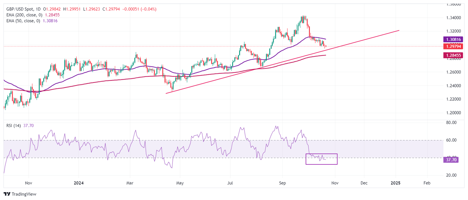 The Pound Sterling slumps to near 1.2950 in North American trading hours. The outlook of the GBP/USD pair is bearish as it remains below the 50-day Exponential Moving Average (EMA), which trades around 1.3080.