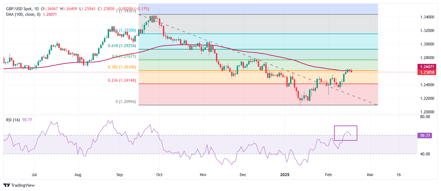 The Pound Sterling falls back below the key level of 1.2600 against the US Dollar in North American trading hours on Wednesday. The GBP/USD pair faces pressure while attempting to break above the 38.2% Fibonacci retracement, which coincides with the 100-day Exponential Moving Average (EMA), around 1.2620.