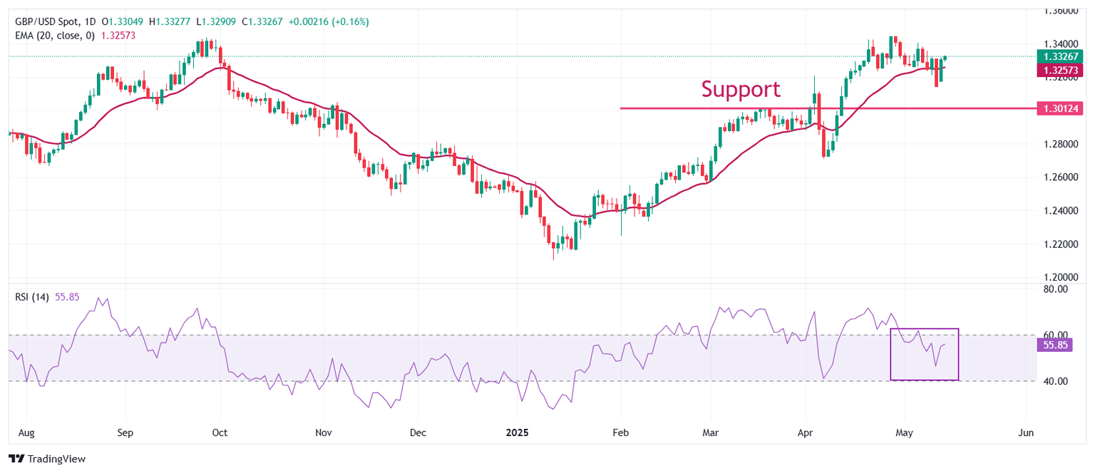 The Pound Sterling (GBP) gains further to near 1.3350 against the US Dollar (USD) in Wednesday’s North American session. The GBP/USD pair extends Tuesday's recovery move as the US Dollar retraces further after the release of the softer-than-expected United States (US) Consumer Price Index (CPI) data for April on Tuesday.