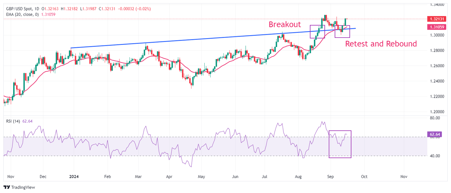 The Pound Sterling holds gains near 1.3200 against the US Dollar in European trading hours. The near-term outlook of the GBP/USD pair remains firm as it holds above the 20-day Exponential Moving Average (EMA) near 1.3100. Earlier, the Cable strengthened after recovering from a corrective move to near the trendline plotted from the December 28, 2023, high of 1.2828, from where it delivered a sharp increase after a breakout on August 21.