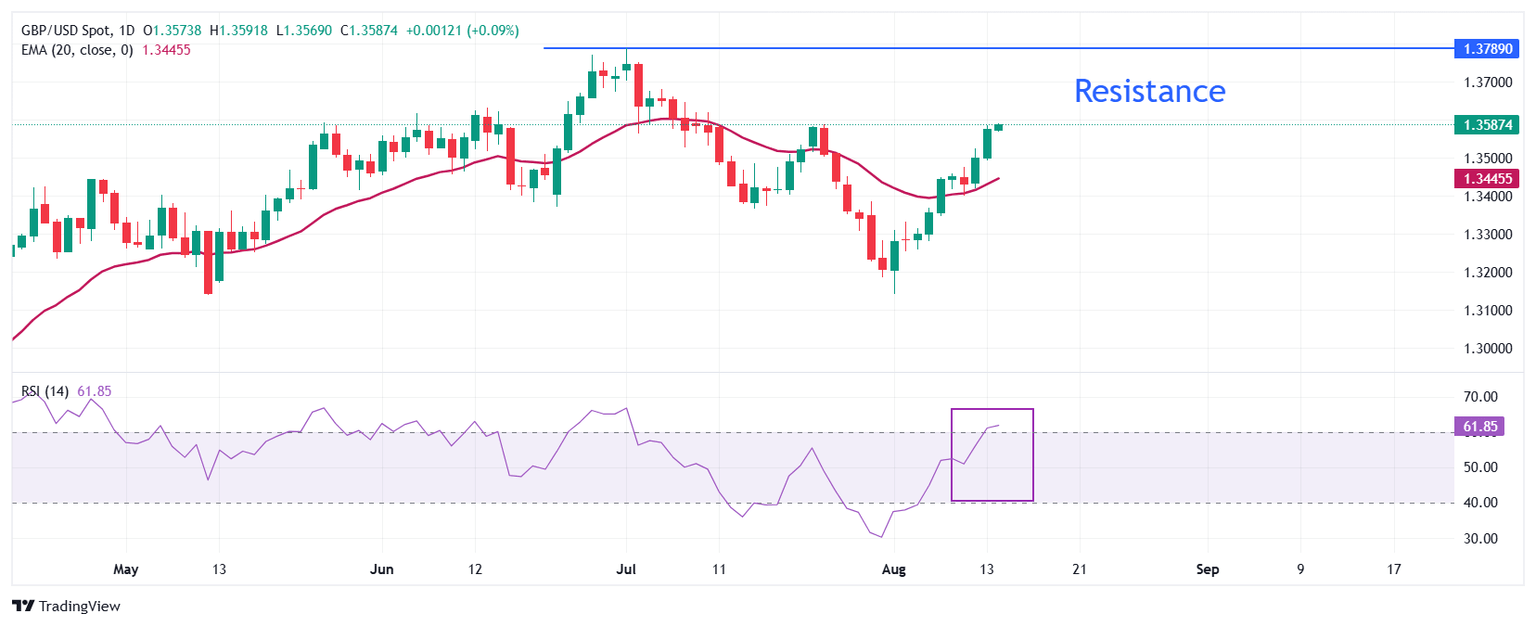 The Pound Sterling advances to near 1.3600 against the US Dollar on Thursday, the highest level seen in a month. The near-term trend of the GBP/USD pair remains bullish as it holds the 20-day Exponential Moving Average (EMA), which trades around 1.3445.