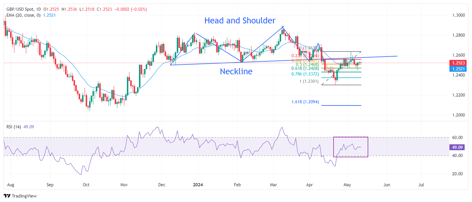 The Pound Sterling advances to 1.2540 on Monday due to multiple tailwinds. The GBP/USD pair recovered sharply from 50% Fibonacci retracement (plotted from April 22 low of 1.2299 to May 3 high of 1.2634) near 1.2470. The Cable remains sticky to the 20-day Exponential Moving Average (EMA), which trades around 1.2520, suggesting a sideways trend.