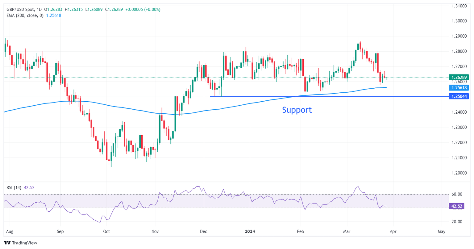 The Pound Sterling discovers some buying interest near the round-level support of 1.2600. The GBP/USD pair falls after facing stiff resistance while extending the upside above the 1.2660 hurdle. The pair trades slightly higher than the 200-day Exponential Moving Average (EMA), placed around 1.2565. The asset would extend its downside if it drops below the 200-day EMA.