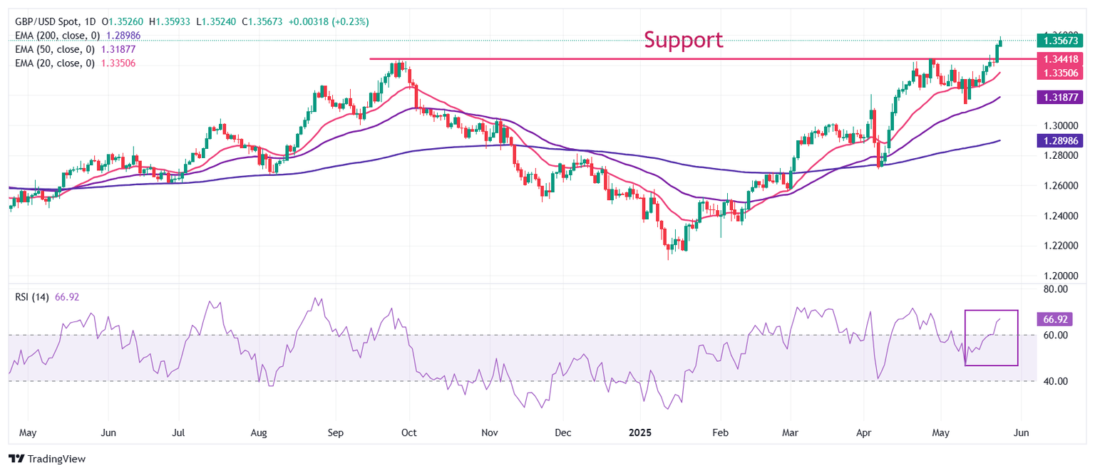 - The Pound Sterling posts a fresh three-year high near 1.3600 against the US Dollar (USD) at the start of the week, amid holidays in the United Kingdom (UK) and the United States (US) markets on account of the Spring Bank Holiday and Memorial Day, respectively. The GBP/USD pair has extended the upside as the US Dollar slides further after “ever-changing” tariff announcements by US President Donald Trump on imports from the European Union (EU) have renewed concerns over its safe-haven appeal.