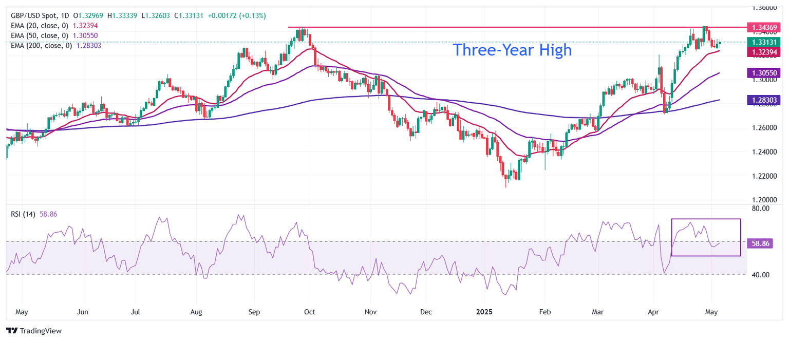 The Pound Sterling climbs to near 1.34000 against the US Dollar on Tuesday. The pair strives to revisit the three-year high of 1.3445. The overall outlook remains bullish as all short-to-long Exponential Moving Averages (EMAs) are sloping higher.