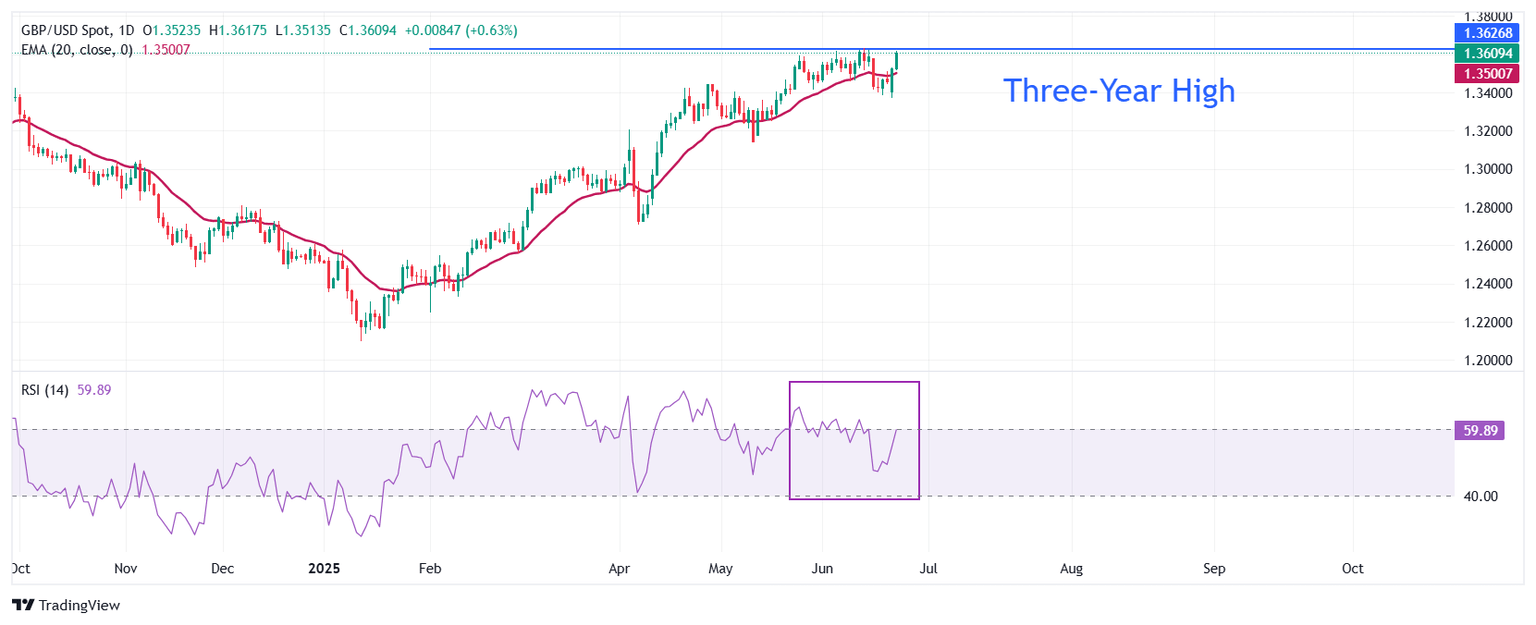 The Pound Sterling (GBP) extends its Monday’s upside move to near 1.3630 against the US Dollar (USD) during European trading hours on Tuesday. The GBP/USD pair strengthens as a global risk rally driven by the ceasefire between Israel and Iran has dampened demand for safe-haven assets such as the US Dollar.