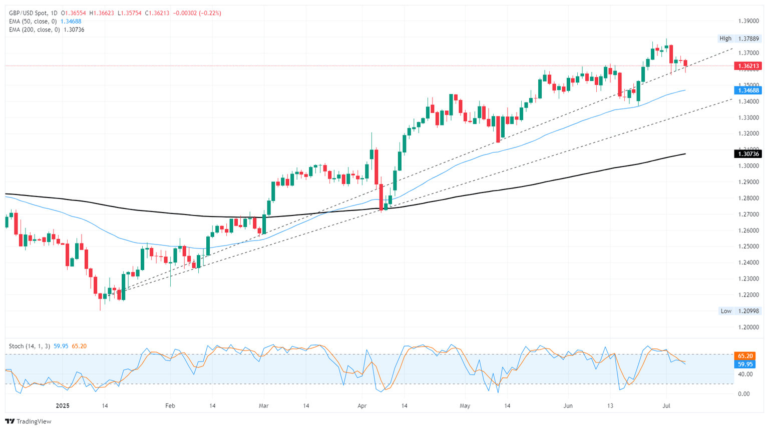 GBP/USD edges higher after two days of losses, trading around 1.3630 during the Asian hours on Tuesday. The pair appreciates as the US Dollar (USD) loses ground as traders adopt caution after US President Donald Trump announced updated tariff rates on 14 countries that have yet to secure trade deals with Washington.