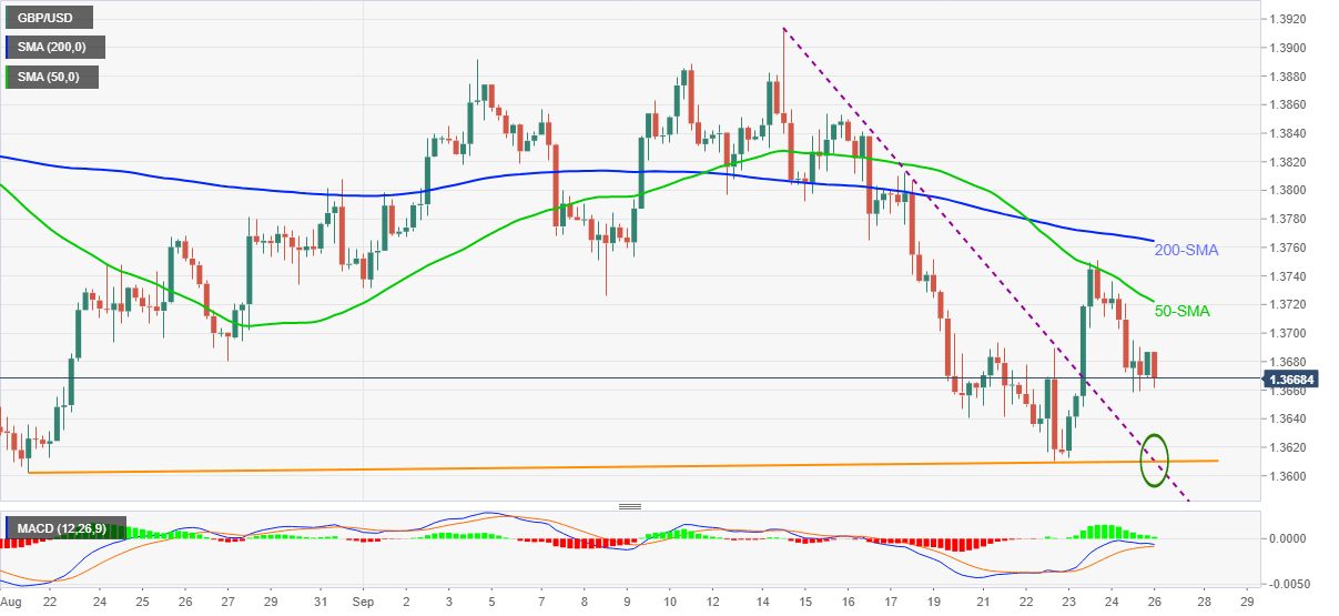 GBP/USD stays pressured around 1.3670 during the early Asian session on Monday. The cable pair kept Thursday’s pullback from 50-SMA to contribute towards a three-week downtrend by the end of Friday.