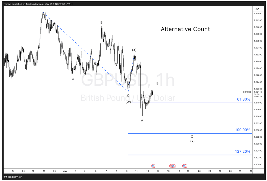 The GBP/USD 1-hour chart presents a compelling Elliott Wave structure, suggesting the potential completion of a corrective Wave (C) at the recent low near the 1.3140 region. According to the primary count, this could mark a significant inflection point, indicating that the pair may have bottomed out and is beginning a new impulsive rally.