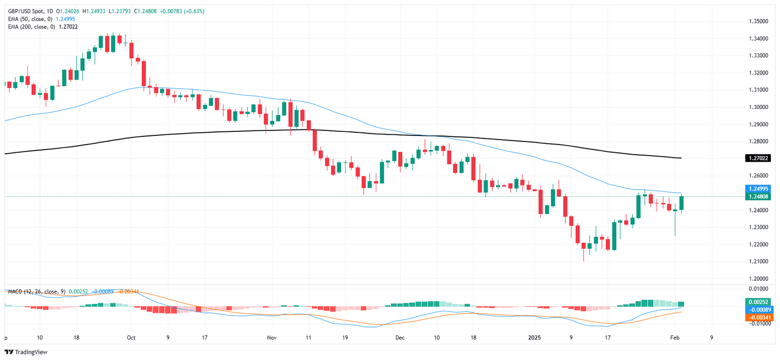 The Pound Sterling (GBP) post gains versus the US Dollar (USD) for the second straight day after US President Donald Trump tariff threats on Mexico and Canada were delayed, due to negotiations beginning between the parties, aimed to improve fighting against fentanyl traffic and illegal migration. The GBP/USD trades at 1.2476 up 0.62%.