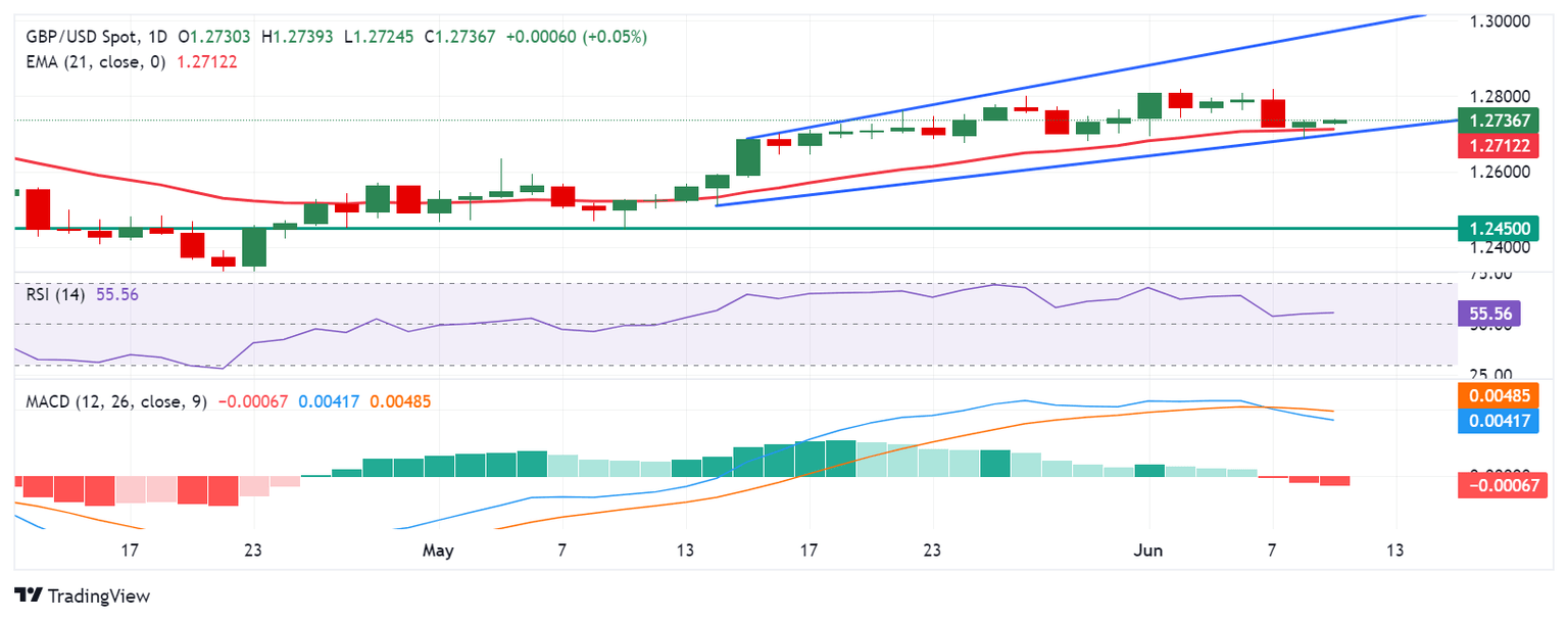 GBP/USD extends its gains for the second successive session ahead of employment data release from the United Kingdom (UK), trading around 1.2740 during the Asian session on Tuesday. The pair consolidates within the rising channel pattern on a daily chart, with the 14-day Relative Strength Index (RSI) positioned above the 50 level. indicating the bullish bias.