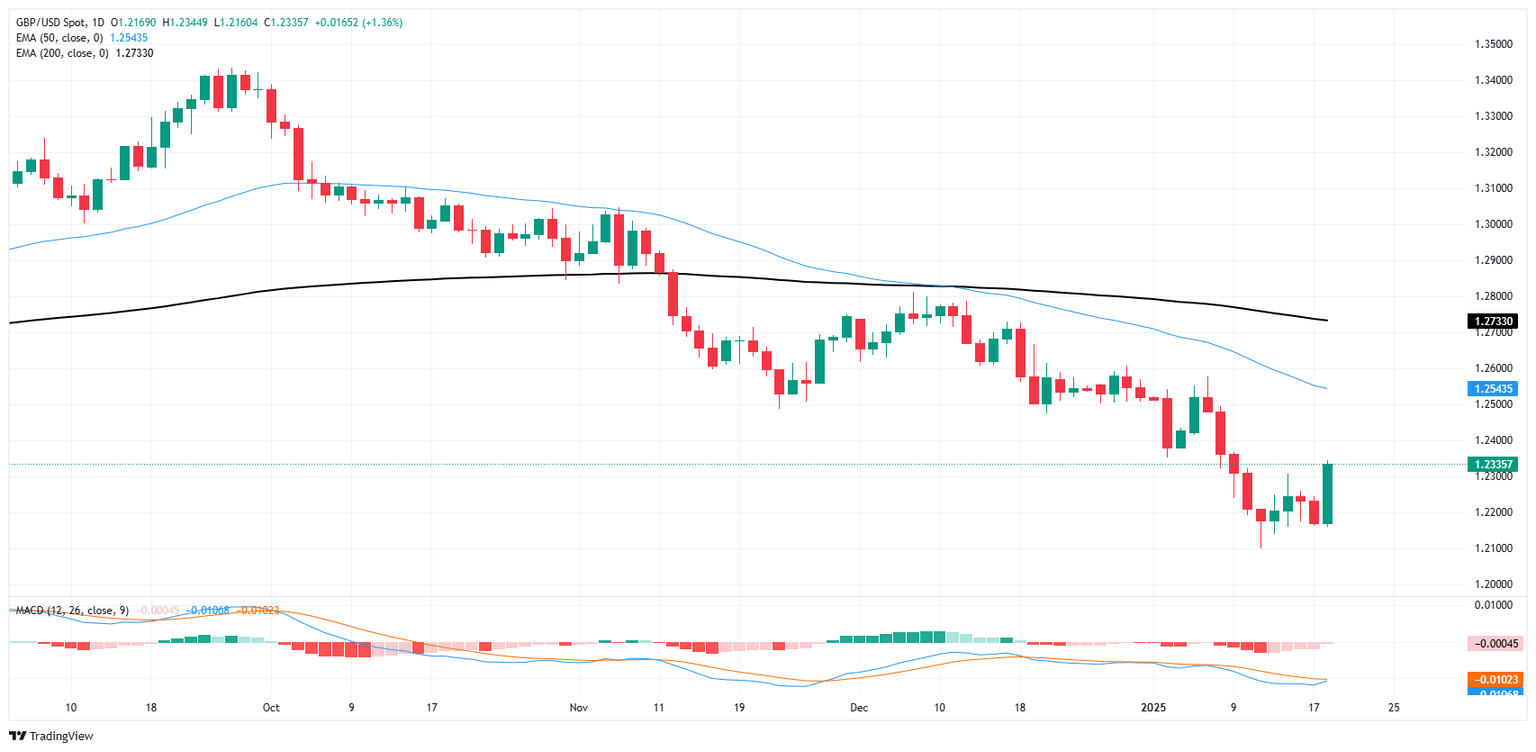 GBP/USD rose 1.35% on Monday, gaining ground and climbing back over the 1.2300 handle as markets breathe a collective sigh of relief after freshly-minted US President Donald Trump made a last-minute pivot away from a broad, sweeping policy of day-one trade tariffs. Back for a second term, Donald Trump is still actively pursuing a policy of reviewing trade circumstances with most of the US’ strongest allies in trade terms, however the returning president has already begun waffling on his campaign promises to use executive orders to apply tariffs of at least 20% across the board, with a 65% import tariff threatened against China specifically.
