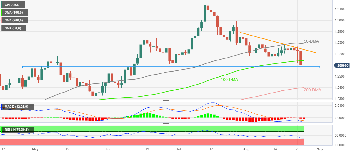 GBP/USD seesaws around the lowest level in two months, after falling the most since late July to refresh the multi-day bottom, as markets await the top-tier central bankers’ speech on early Friday. That said, the Cable pair makes rounds to 1.2600 while poking a four-month-old horizontal support area surrounding 1.2590–2570.