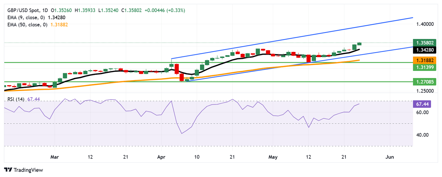 The GBP/USD pair extends its winning streak for the second successive session, trading around 1.3580 during Monday's Asian hours. The technical analysis of the daily chart suggests that a bullish bias prevails as the pair moves upwards within an ascending channel pattern. Read More...