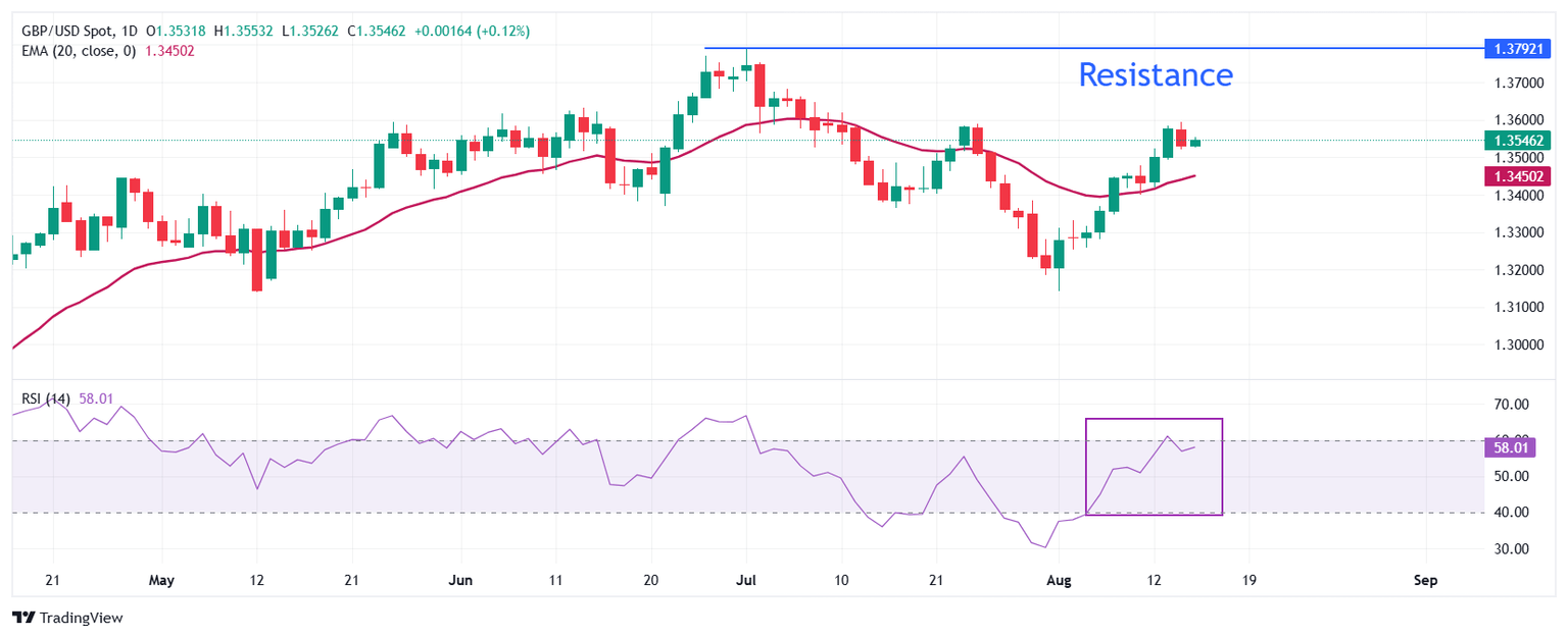 The GBP/USD pair gathers to around 1.3545 during the early European session on Friday, bolstered by a weaker US Dollar (USD). Additionally, the stronger-than-expected UK economic data underpins the Pound Sterling (GBP) against the Greenback. Markets might turn cautious later on Friday as traders await the release of the US July Retail Sales report. Read More...