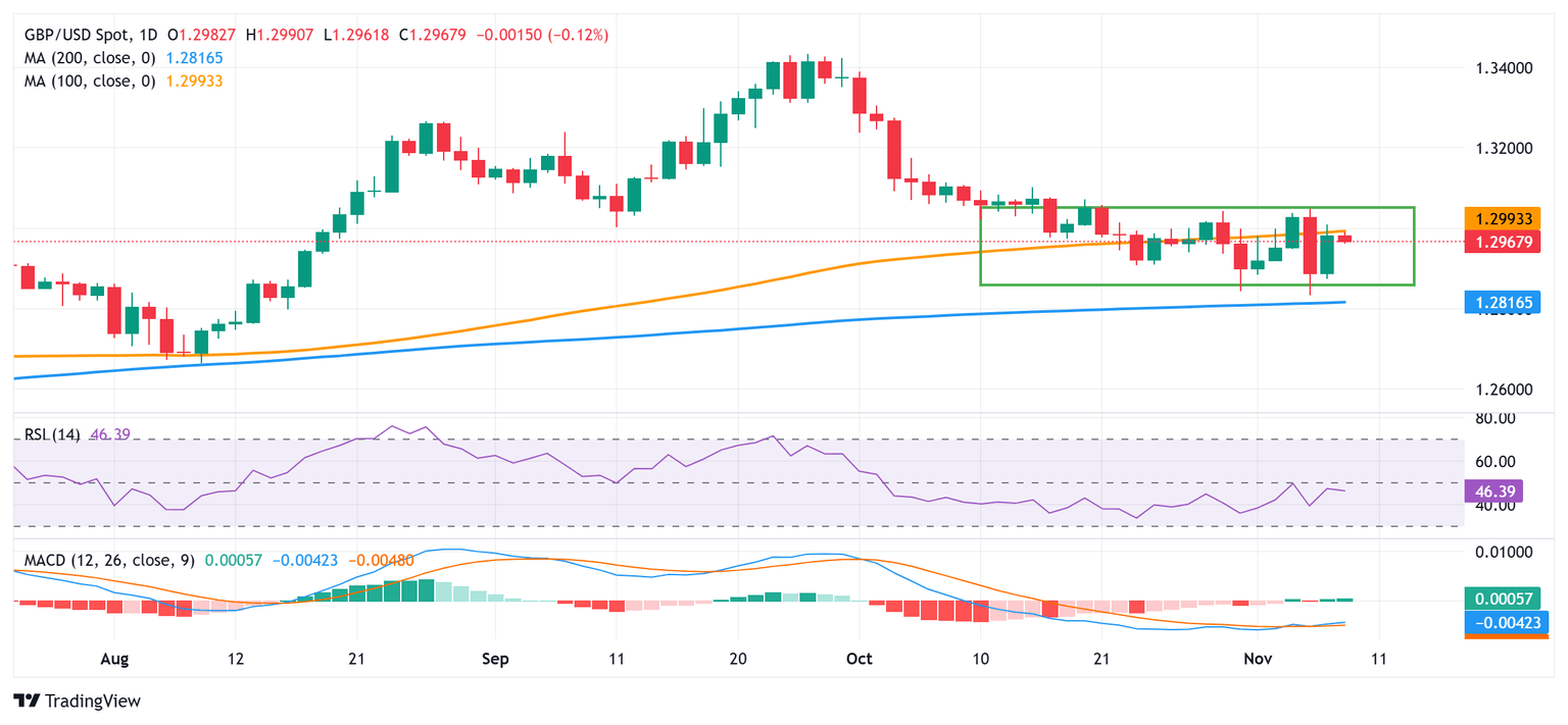 The GBP/USD pair struggles to build on the previous day's positive move and faces rejection near the 100-day Simple Moving Average (SMA) during the Asian session on Friday. Spot prices currently trade around the 1.2965-1.2960 region, down 0.15% for the day amid a modest US Dollar (USD) uptick, though the downside seems limited on the back of the Bank of England's (BoE) hawkish stance.