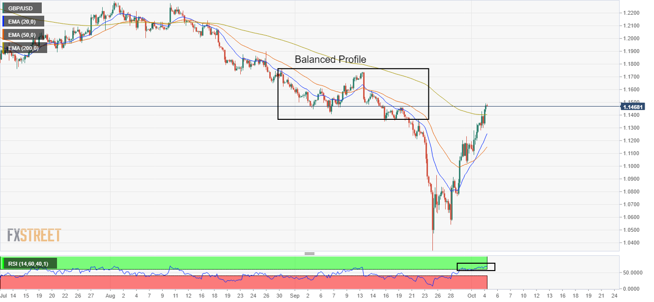 The GBP/USD pair is struggling to smash the psychological resistance of 1.1500 after a juggernaut rally. The asset is gathering momentum at elevated levels and is expected to continue its six-day winning streak after overstepping Tuesday’s high at 1.1490. The major witnessed a responsive buying action after forming a buying tail on September 26.
