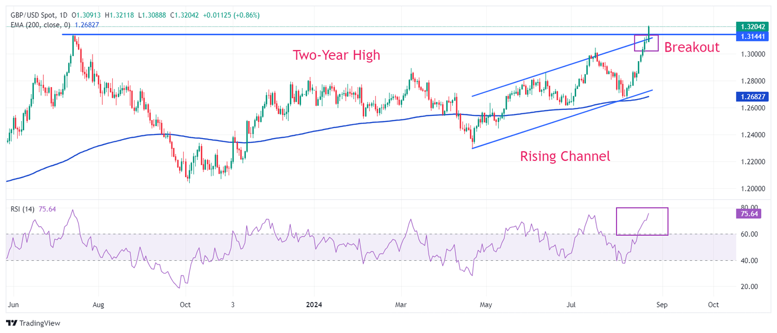 The Pound Sterling (GBP) extends its winning streak for a seventh trading session against the US Dollar (USD) on Friday. The GBP/USD pair posts a fresh two-year high at 1.3200 as the US Dollar (USD) slides toward a year-to-date low after a dovish guidance on interest rates by