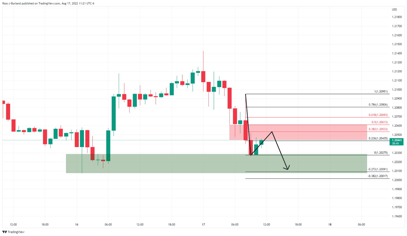 GBP/USD is under pressure in midday New York trade. Cable was last down 0.39% on the day at 1.2046 and has fallen from a high of 1.2142 and met a low of 1.2027 from where it is correcting currently. Markets have been digesting plenty of data this week in the build-up to the Federal Reserve's minutes from its July meeting.