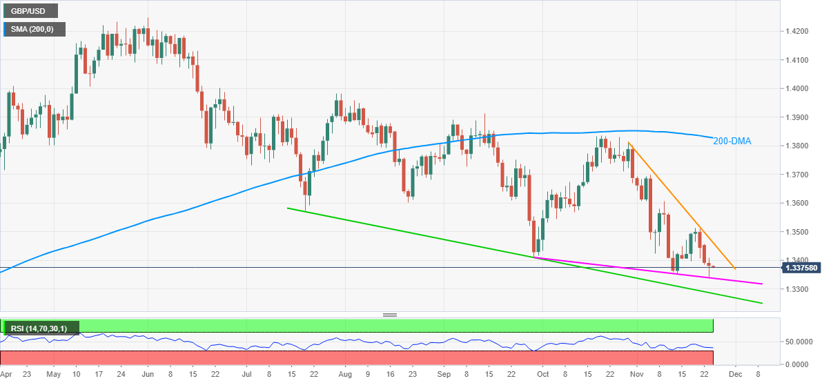 GBP/USD bounces off intraday low to extend the previous day’s U-turn from the 2021 bottom, around 1.3380 during Wednesday’s Asian session. A descending support line from late September triggered the cable pair’s recovery moves on Tuesday.