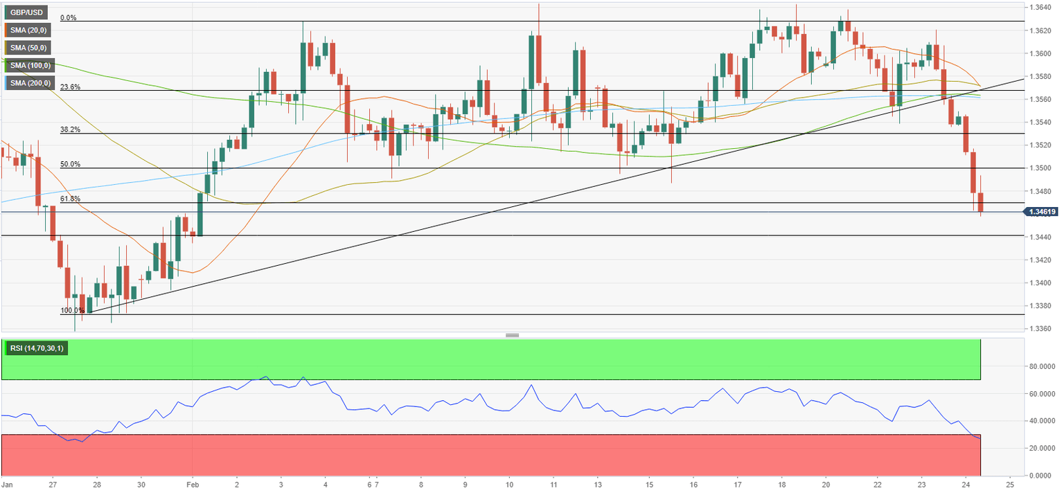GBP/USD has fallen sharply in the early European session on Thursday as investors have started to seek refuge following Russia's decision to launch an attack against Ukraine. GBP/USD is likely to stay on the back foot amid escalating tensions and additional losses could be witnessed if the pair falls below 1.3440. Reflecting the intense flight-to-safety, the UK's FTSE 100 Index is falling more than 2% on a daily basis and US stocks futures indexes are down between 1.9% and 2.3%. The UK is yet to release an official response to Russian aggression and the EU is reportedly preparing the "harshest package of sanctions ever implanted." Read more...