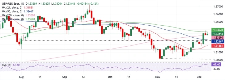 The GBP/USD pair kicks off the new week on a subdued note and oscillates in a narrow trading band, around the 1.3320-1.3325 region, during the Asian session. Spot prices, however, remain close to the highest level since October 22, touched last Thursday, with bulls awaiting a sustained strength and acceptance above the 100-day Simple Moving Average (SMA) before placing fresh bets.