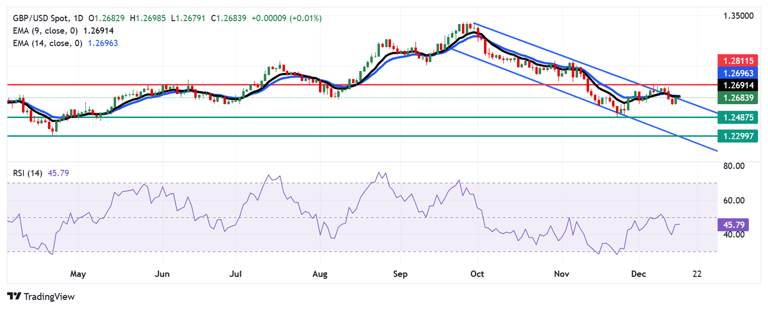 GBP/USD remains flat following gains in the previous session, trading around 1.2680 during the Asian hours on Tuesday. The daily chart analysis suggests a upward momentum shift as the pair attempts to break above the descending channel pattern, aligned with nine- and 14-day Exponential Moving Averages (EMAs).