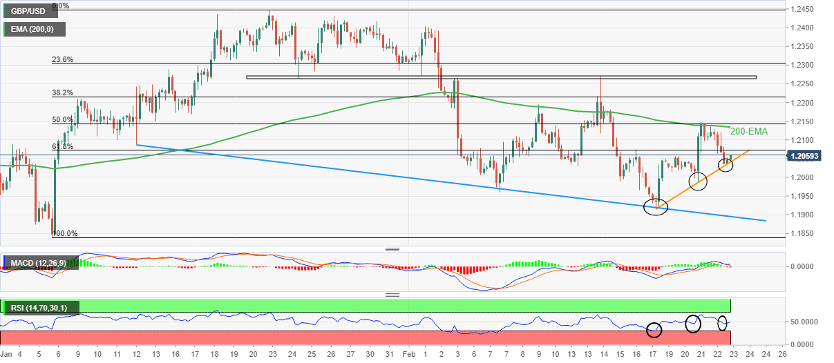 GBP/USD renews its intraday high near 1.2060 as it consolidates the biggest daily loss in more than a during early Thursday. In doing so, the Cable pair rebounds from a one-week-long ascending trend amid hidden bullish RSI divergence.