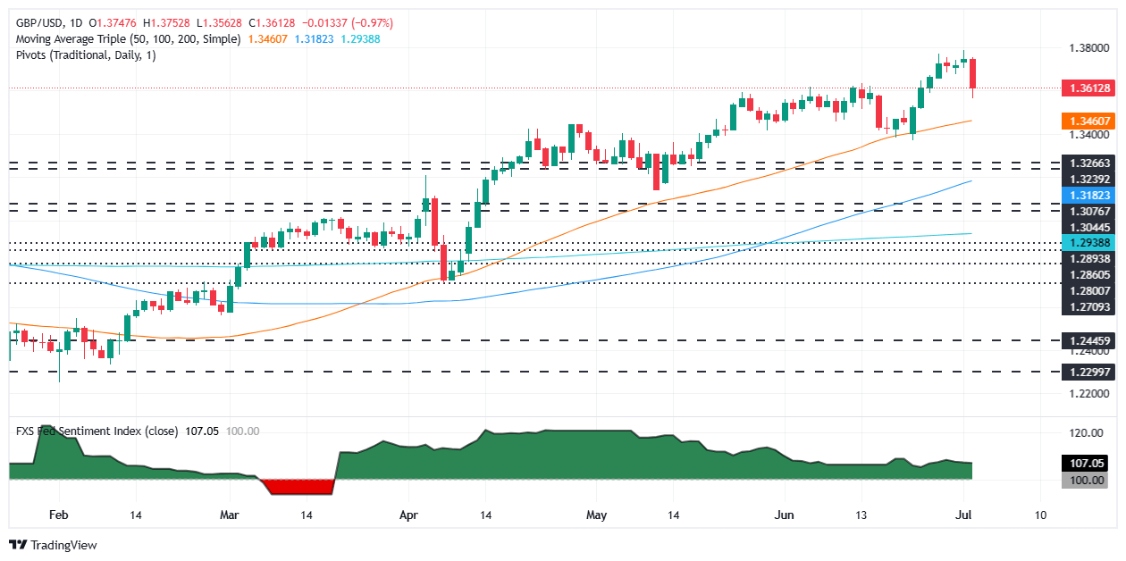 The Pound Sterling (GBP) corrects to near 1.3700 against the US Dollar (USD) during the European trading session on Wednesday from the fresh three-and-a-half-year high around 1.3800 posted the previous day. The GBP/USD pair faces selling pressure as the United States (US) currency gains ground, following upbeat JOLTS Job Openings data for May. Read More...