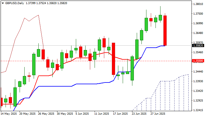 Fresh weakness (Cable was down almost 1% for the day) adds to reversal signal that is developing on daily chart, as today’s action was shaped in long bearish candle, after the pair has registered six consecutive daily gains. Read more...
