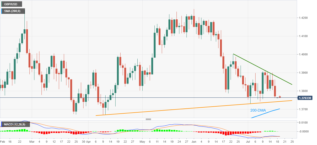 GBP/USD sellers attack a one-week low of around 1.3760 amid a lacklustre Asian session on Monday. In doing so, the cable pair stays pressured for the third day in a row after failing to cross a downward sloping trend line from June 23.
