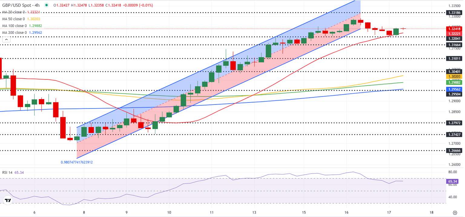 GBP/USD moves sideways in a tight channel above 1.3250 in the European session on Friday after posting small gains on Thursday. The pair remains on track to end the week in positive territory.