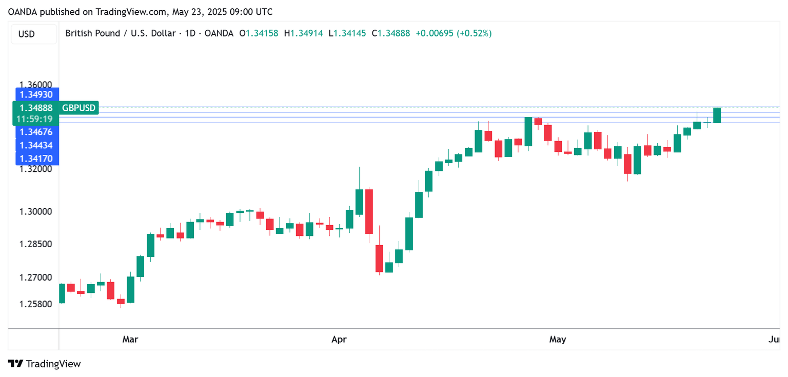 Cable rose 0.5% on Friday morning and cracked psychological 1.3500, hitting the highest since February 2022. Fresh acceleration higher was sparked by upbeat UK retail sales, which strongly beat forecasts in April and boosted risk sentiment.