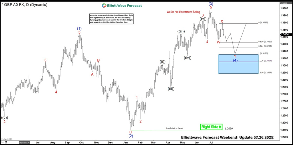 In this technical article, we are going to talk about another Elliott Wave trading setup we got in GBPUSD. The pair has completed its correction exactly at the Equal Legs zone, also known as the Blue Box Area. In this article, we’ll break down the Elliott Wave forecast, explain the trading setup in detail, and provide the upside target.