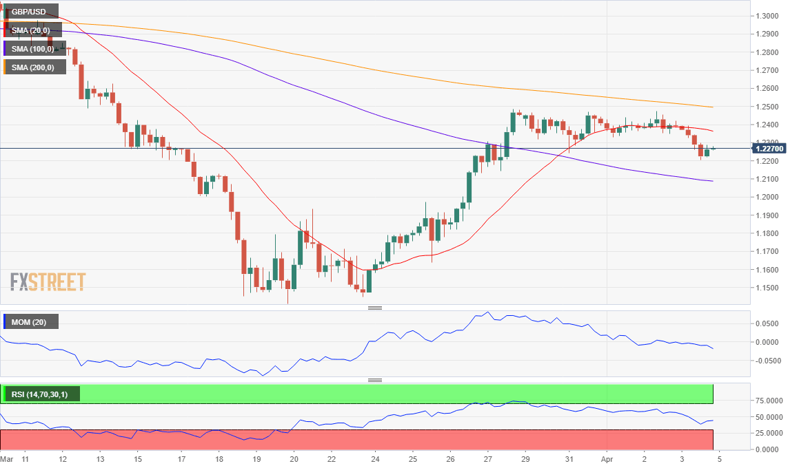 The GBP/USD pair ended the week with losses around 1.2270, although it held at the upper end of its previous weekly range. The pair fell to 1.2204 on Friday amid the resurgent dollar’s demand, although meeting buyers around the level, as the Pound remains resilient. On Friday, Markit released the final version of the UK March Services PMI, which was downwardly revised to 34.5 from a preliminary estimate of 35.7. At the beginning of the week, Markit will release the March Construction PMI for the kingdom, previously at 52.6.