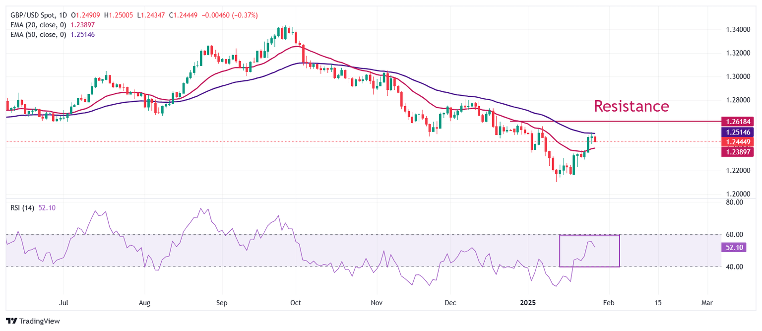 GBP/USD remains steady after registering losses in the previous session, trading around 1.2440 during the Asian hours on Wednesday. The pair’s downside could be attributed to the increased risk aversion due to tariff threats made by US President Donald Trump.