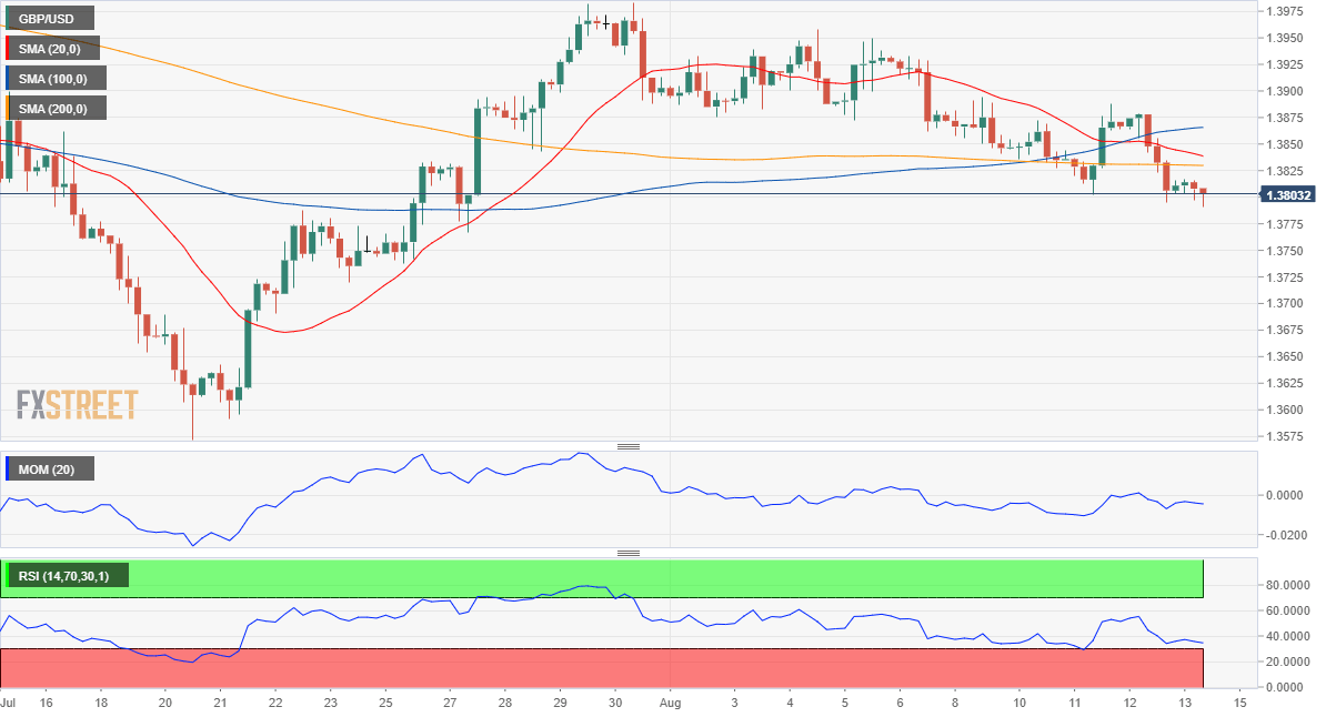 The GBP/USD pair consolidates at the lower end of its weekly range, trading around the 1.3800 level. Major pairs had been lifeless as volatility plummeted following the release of US July inflation, which spur some temporal and limited dollar’s weakness. However, the American currency has recovered most of the ground shed then and trades near weekly highs across the FX board. The pound is its weakest rival, while safe-haven JPY and Gold are the strongest. Read more...